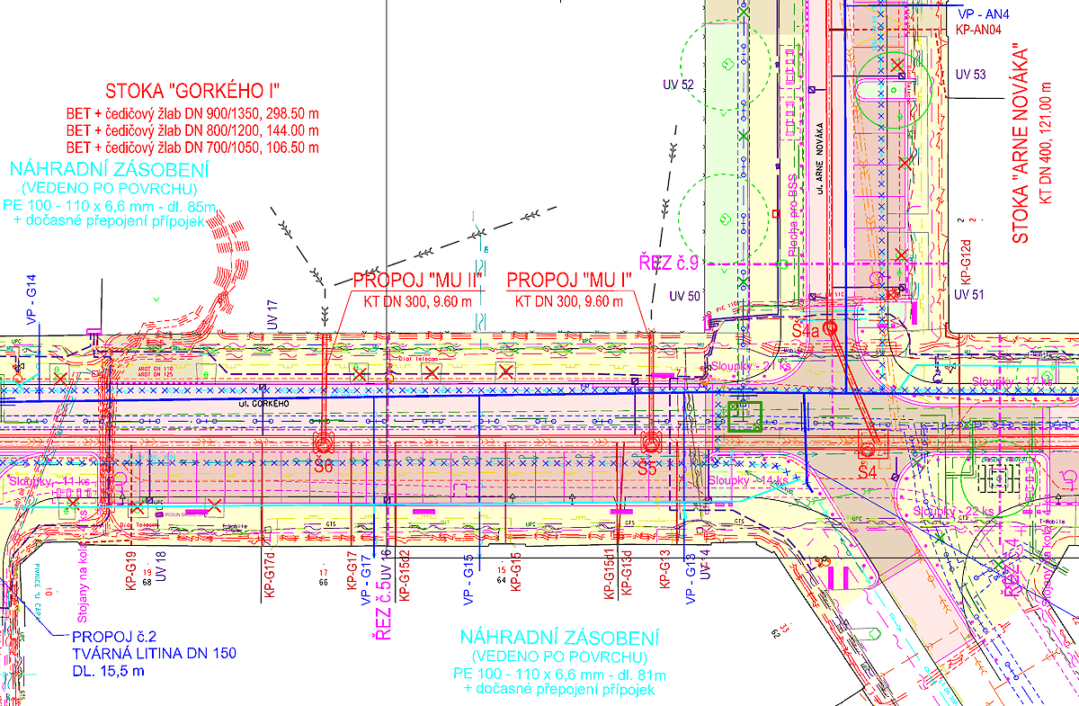 Vzhledem ke stísněným podmínkám, kdy se v ulici Gorkého nachází i horkovod, bylo využito železobetonové vejčité potrubí DN 700/1050, až DN 900/1350 o celkové délce 554 m. V ulici Arne Nováka byly využity kameninové trouby DN 400 o celkové délce 140 m. Vodovodní řady byly nahrazeny novým potrubím tvárné litiny ve stávajících dimenzích DN 100, DN 150 a DN 300 v celkové délce 727 m. Součástí projektu byla také oprava kanalizačních a vodovodních přípojek.
